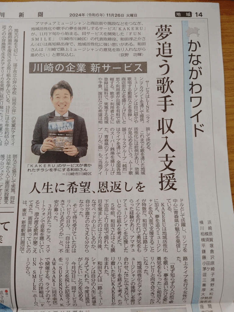 神奈川新聞に掲載していただきました! 投稿日 2025年1月2日 更新日 2025年10月27日 著者 test カテゴリー 未分類 11月26日の神奈川新聞に シンガーマッチングサービス「KAKERU」の 取り組みを掲載していただきました。 WEB記事⇒ https://www.kanaloco.jp/limited/node/1128549